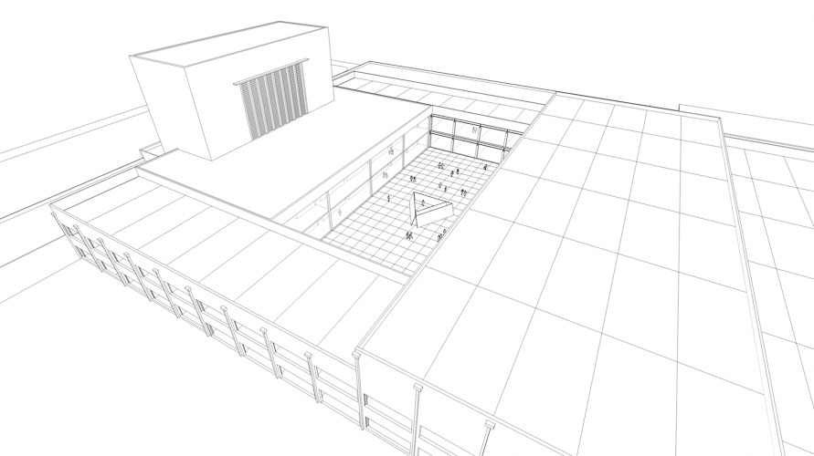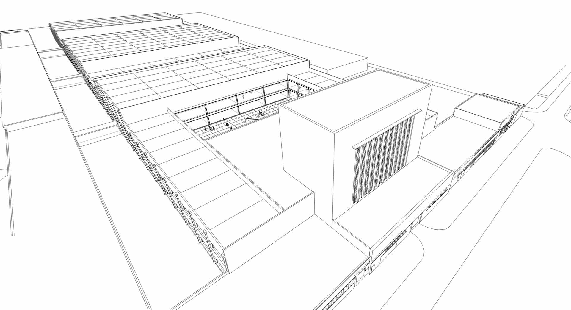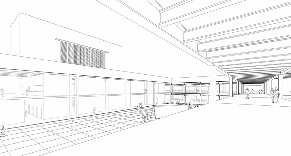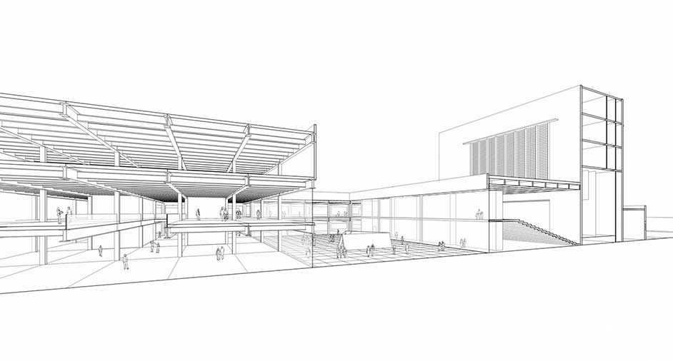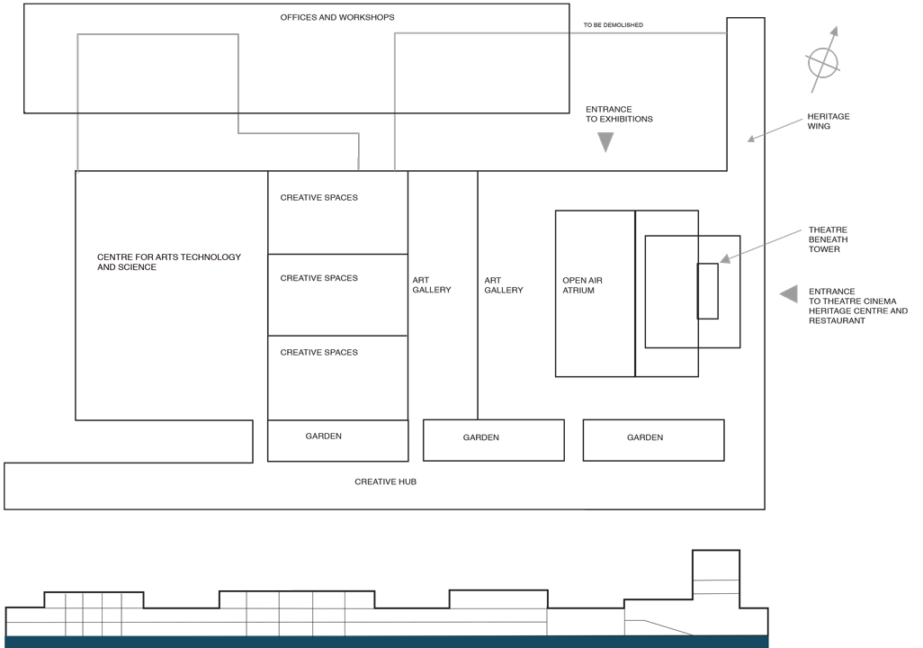 The tower will house the theatre, restaurant and cinema complex with the space behind proposed as an open-air atrium where large outdoor sculpture can be exhibited. The resulting structure around becomes a vast display area available for the main non-permanent art exhibitions, providing a link between the gallery and the theatre blocks, with greater gallery space beyond. The theatre has a seating capacity of 800 to 1000 spectators, with the stage and backstage areas located under the tower. Above the theatre, the tower has three levels, two for cinemas and one for a bar and restaurant, with the rooftop becoming part of this recreational area.